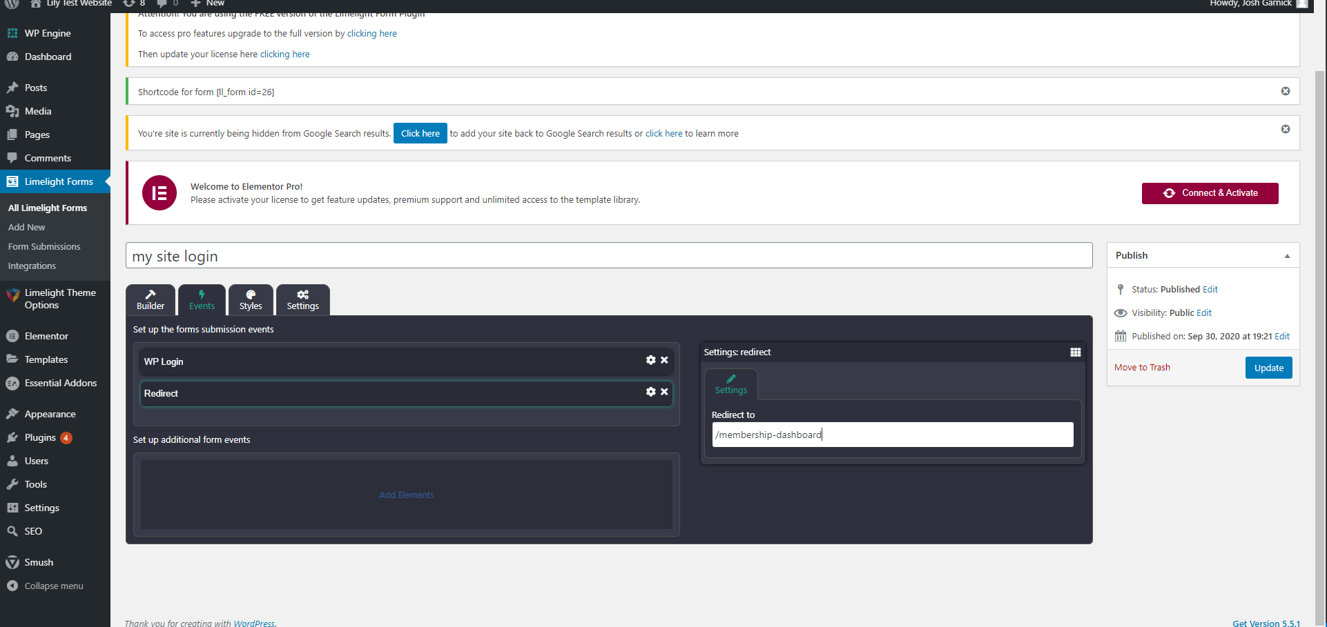 You are also able to set up a Redirect event after a user registers or logs in. To do that, you’ll go to your registration form that you created in Limelight forms, click the Events tab, and then drag and drop the “Redirect” action underneath the “WP Login” or “WP Register User” action. On the right side, you’ll be able to set which web page you want your users to be redirected to after they sign up and fill out the form. In this case, we used the example of a “Membership Dashboard” page we created for members to be redirected to after they successfully log in.